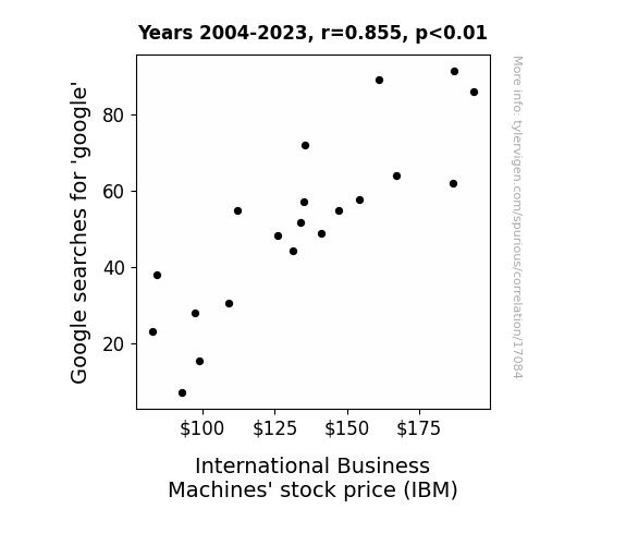 This means 73.2% of the change in the one variable (i.e., International Business Machines' stock price (IBM)) is predictable based on the change in the other (i.e., Google searches for 'google') over the 20 years from 2004 through 2023.
