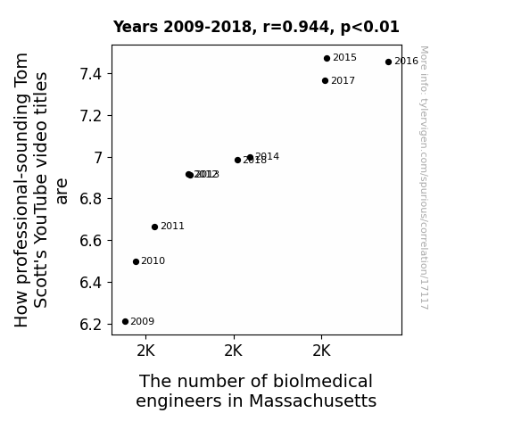 This means 89.1% of the change in the one variable (i.e., The number of biolmedical engineers in Massachusetts) is predictable based on the change in the other (i.e., How professional-sounding Tom Scott's YouTube video titles are) over the 10 years from 2009 through 2018.
