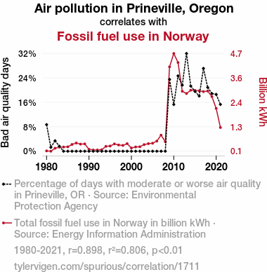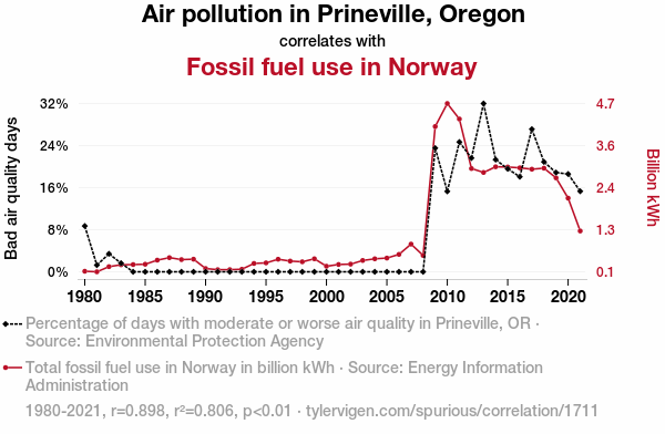 This means 80.6% of the change in the one variable (i.e., Fossil fuel use in Norway) is predictable based on the change in the other (i.e., Air pollution in Prineville, Oregon) over the 42 years from 1980 through 2021.