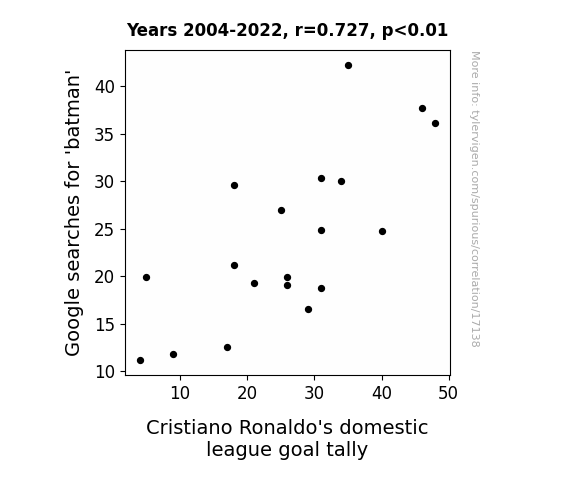 This means 52.8% of the change in the one variable (i.e., Cristiano Ronaldo's domestic league goal tally) is predictable based on the change in the other (i.e., Google searches for 'batman') over the 19 years from 2004 through 2022.