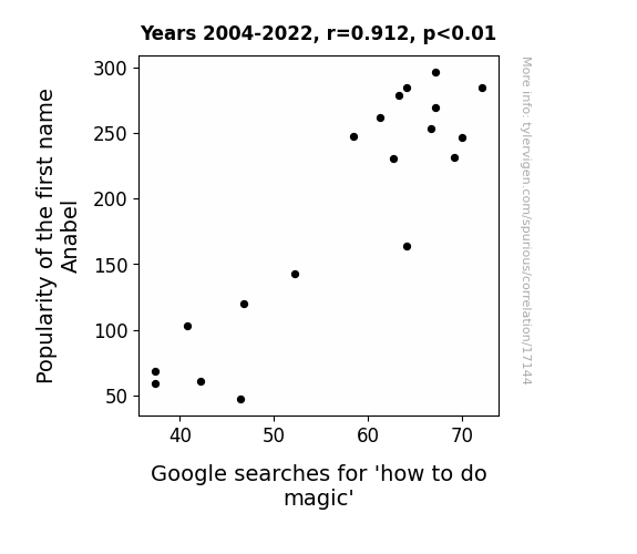 This means 83.1% of the change in the one variable (i.e., Google searches for 'how to do magic') is predictable based on the change in the other (i.e., Popularity of the first name Anabel) over the 19 years from 2004 through 2022.