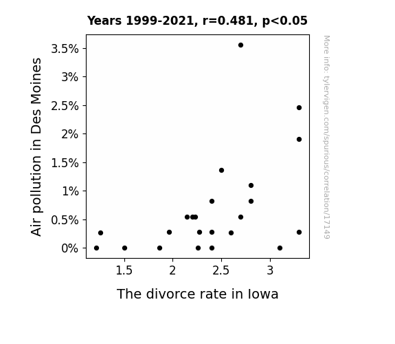 This means 23.1% of the change in the one variable (i.e., The divorce rate in Iowa) is predictable based on the change in the other (i.e., Air pollution in Des Moines) over the 23 years from 1999 through 2021.