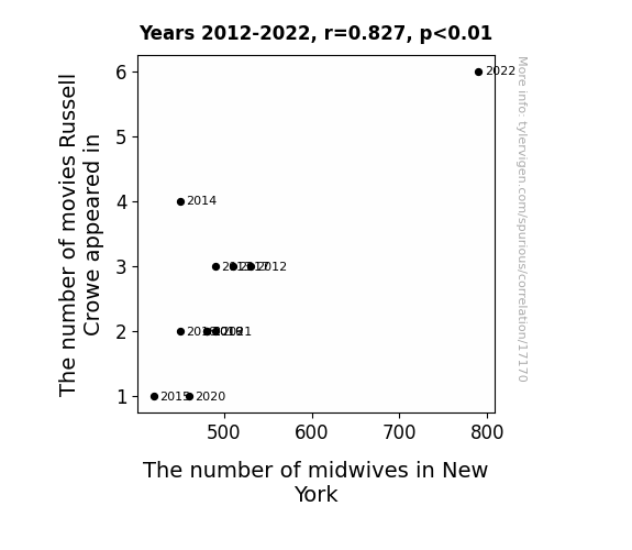 This means 68.3% of the change in the one variable (i.e., The number of midwives in New York) is predictable based on the change in the other (i.e., The number of movies Russell Crowe appeared in) over the 11 years from 2012 through 2022.