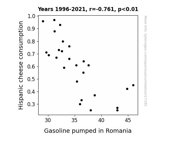 This means 57.9% of the change in the one variable (i.e., Gasoline pumped in Romania) is predictable based on the change in the other (i.e., Hispanic cheese consumption) over the 26 years from 1996 through 2021.