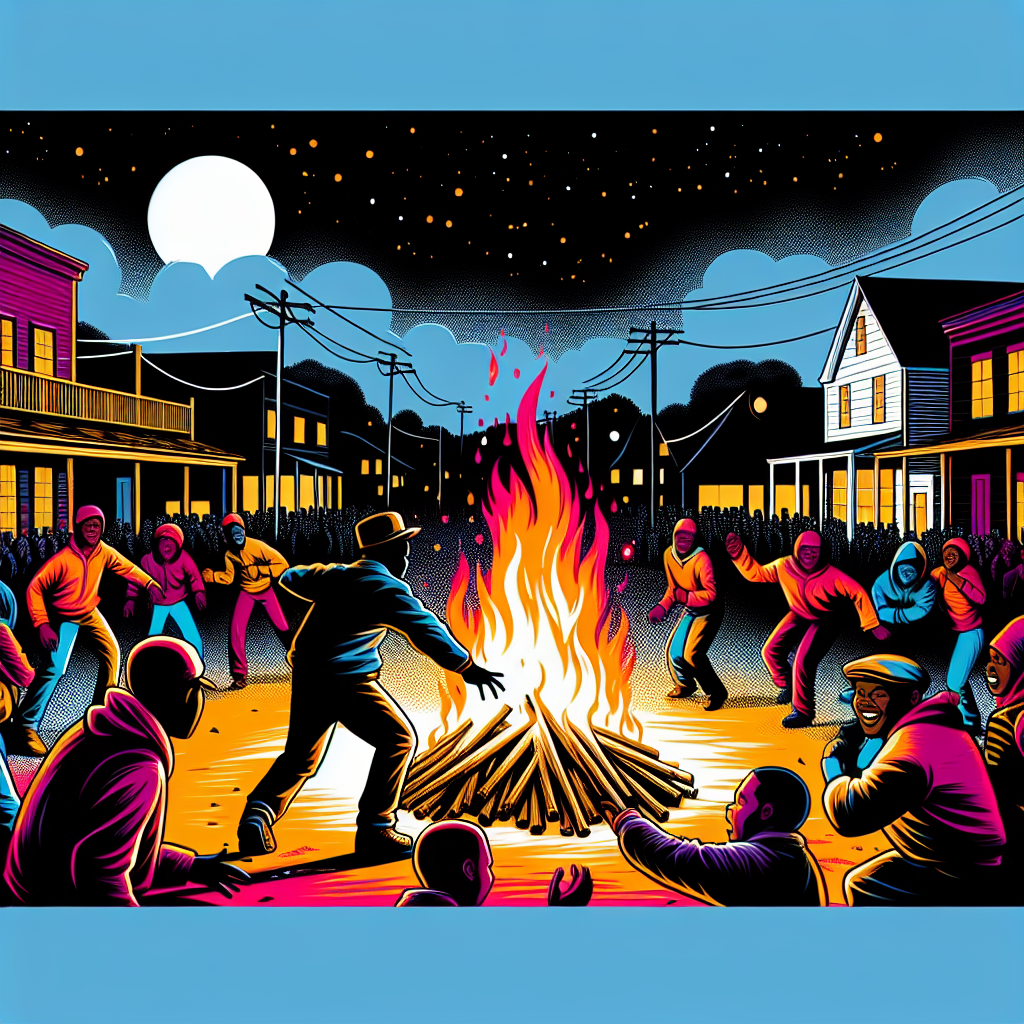 User prompt: Please respond with an image generation prompt that would be likely to create an interesting visual using DALLE-3, using the following style: [ Pop art ] and depicting this scene: In a small town in New Mexico, a group of people gathers around a bonfire, cheering and dancing as the flames illuminate the night sky. Among them, a man named Kelvin, popular and well-liked by the community, is leading the festivities. However, in the distance, a faint trail of smoke rises from a nearby building, where a recent incident of arson has occurred. The contrast between the joyful celebration and the unsettling act of arson creates a juxtaposition in the otherwise peaceful town. Keep the visual depiction simple. Do not include any words or speech bubbles.