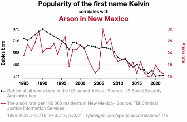- The spurious research paper: The Kelvin Conundrum: Correlating the Popularity of the Name and Pyromania in New Mexico