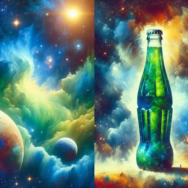 Prompt: Generate an image of a distant, expansive nebula with hues of vibrant blue and green, representing the vast expanse between Neptune and Uranus. At the heart of the nebula, an imposing Coca-Cola bottle gleams amidst the cosmic spectacle, symbolizing The Coca-Cola Company's stock value. Embody the scene with the stark, angular forms and robust textures characteristic of brutalist design. The depiction should include only scenes, people, and objects, it should not include text or speech bubbles.