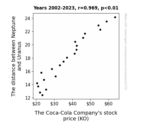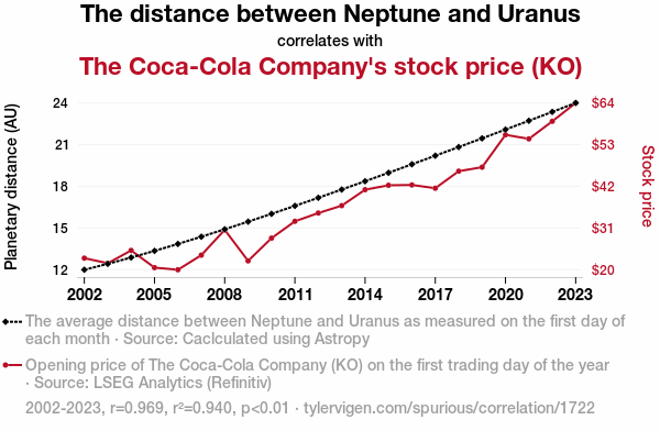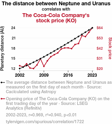 - The spurious research paper: Neptune's Neighbors and the Noteworthy Nectar: An Analysis of the Association between the Distance between Neptune and Uranus and The Coca-Cola Company's stock price