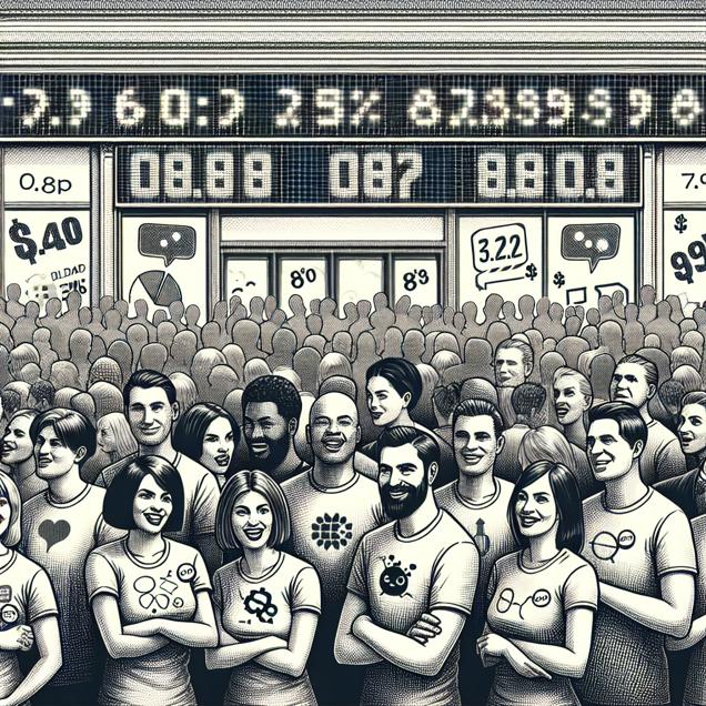 Prompt: Generate an image of a grayscale newspaper illustration portraying a group of people wearing customized "Wesley" t-shirts queuing outside a Dollar Tree store. The enthusiastic crowd eagerly anticipates entering the store as the stock price ticker for Dollar Tree is prominently displayed on a digital screen in the background, subtly indicating the financial aspect associated with the store. The depiction should include only scenes, people, and objects, it should not include text or speech bubbles.