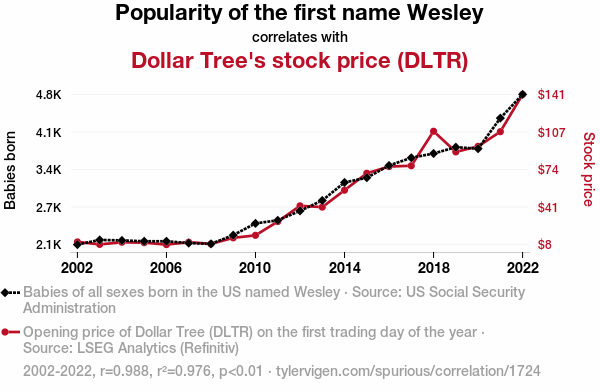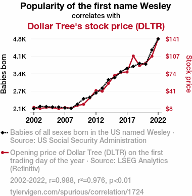 As the popularity of the name Wesley rose, so did the demand for Wes Anderson films. This led to an uptick in quirky, indie movie preferences, prompting more people to seek out unique and offbeat items at Dollar Tree. The increased traffic and sales at the stores then bolstered investor confidence, ultimately boosting Dollar Tree's stock price. It's a Wes-tern economic phenomenon!