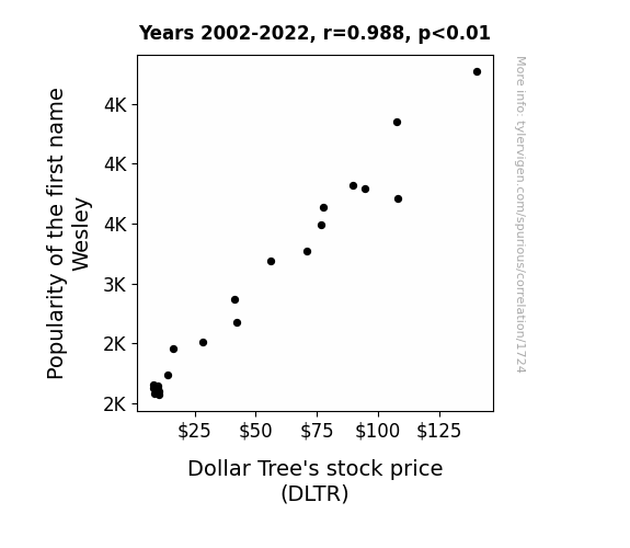 With a correlation coefficient of 0.9880488 and a p-value less than 0.01 from 2002 to 2022, our findings indicate a striking link between the ebb and flow of Wesley's popularity and the fluctuating fortunes of Dollar Tree's stock price. It seems the name Wesley isn't just a favorite among parents; it might also be pulling the financial strings of a major retail player! Talk about a name that's making cents and dollars simultaneously!