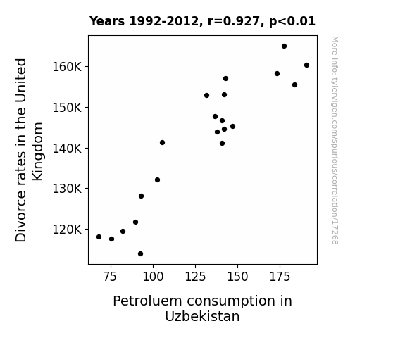 This means 85.9% of the change in the one variable (i.e., Petroluem consumption in Uzbekistan) is predictable based on the change in the other (i.e., Divorce rates in the United Kingdom) over the 21 years from 1992 through 2012.