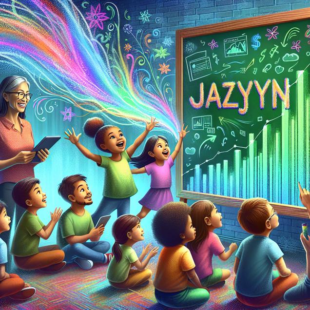 ChatGPT: A group of excited children gathers around a chalkboard, where the name "Jazlyn" is written in colorful letters. A parent standing nearby checks their phone and smiles as they see the stock price of Vale S.A. rising on the screen.