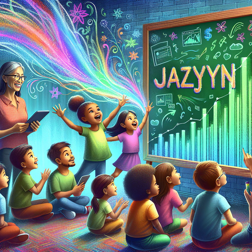 Prompt: [ Whimsical illustration ] Create an image of a lively scene where a group of children, filled with excitement, gather around a vibrant chalkboard. On the chalkboard, the name "Jazlyn" is written in playful, colorful letters. In the background, a parent stands nearby, checking their phone and wearing a contented smile as they observe the stock price of Vale S.A. rising on the screen. The depiction should include only scenes, people, and objects, it should not include text or speech bubbles.