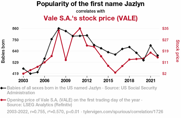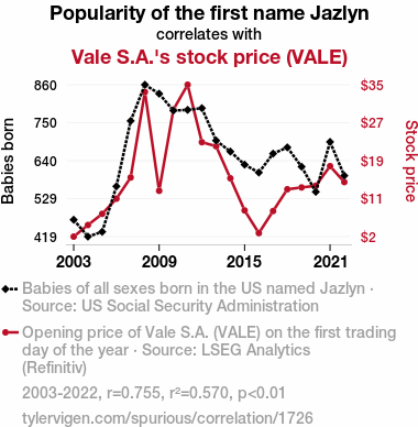 - The spurious research paper: Jazlyn's Popularity and Vale's Stock Volatility: A Tale of Names and Gains