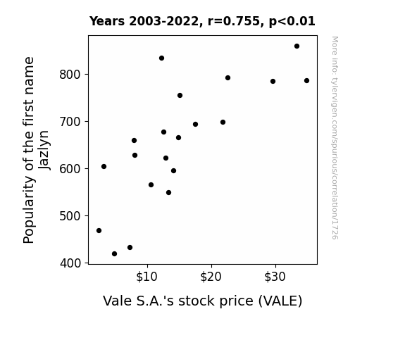 Jazlyn name popularity, Vale stock volatility, correlation between name popularity and stock performance, human names and stock prices, Jazlyn name prevalence and Vale stock fate, correlation coefficient and significance level, stock market influence and human names