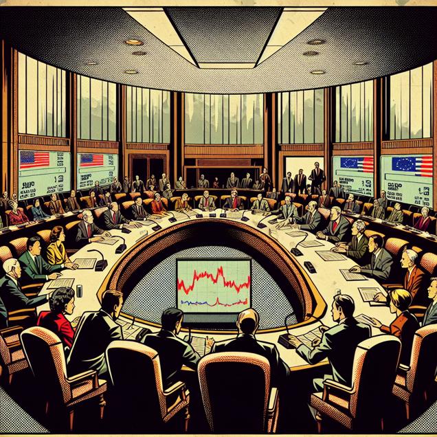 Prompt: Create a comic-book-style illustration with muted colors and a dotted halftone pattern from the 1960s, depicting a scene in a room in the Alaska State Capitol. In the room, 60 legislators are gathered around a large table, engaged in discussions about future policies and regulations. A nearby screen displays the current Tesla stock price, fluctuating as the legislators continue their discussions. The room is dimly lit, with shadows adding depth to the scene, and the legislators are drawn with exaggerated, expressive features to capture their animated conversation. The depiction should include only scenes, people, and objects, it should not include text or speech bubbles.