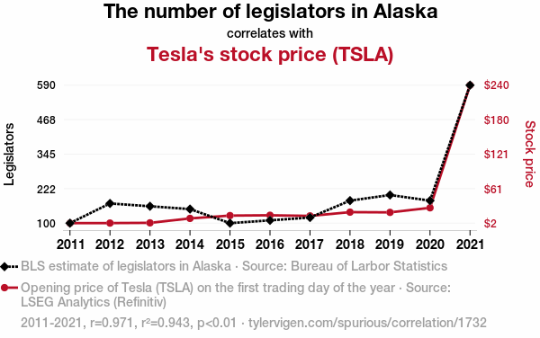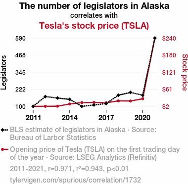 - The spurious research paper: Legislate to Elevate: Analyzing the Legislators in Alaska and the Electrifying Effects on Tesla's Stock Price