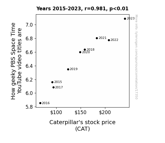 This means 96.2% of the change in the one variable (i.e., Caterpillar's stock price (CAT)) is predictable based on the change in the other (i.e., How geeky PBS Space Time YouTube video titles are) over the 9 years from 2015 through 2023.