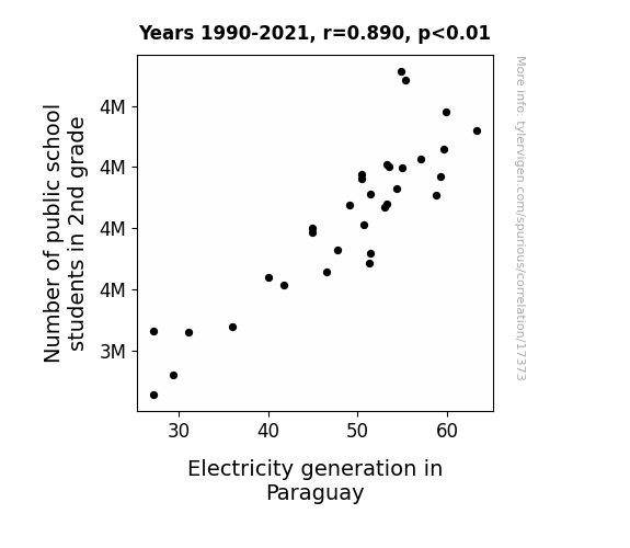 This means 79.2% of the change in the one variable (i.e., Electricity generation in Paraguay) is predictable based on the change in the other (i.e., Number of public school students in 2nd grade) over the 32 years from 1990 through 2021.