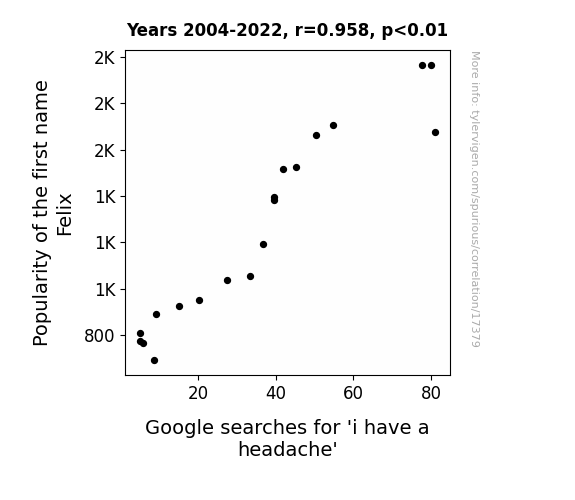 This means 91.7% of the change in the one variable (i.e., Google searches for 'i have a headache') is predictable based on the change in the other (i.e., Popularity of the first name Felix) over the 19 years from 2004 through 2022.
