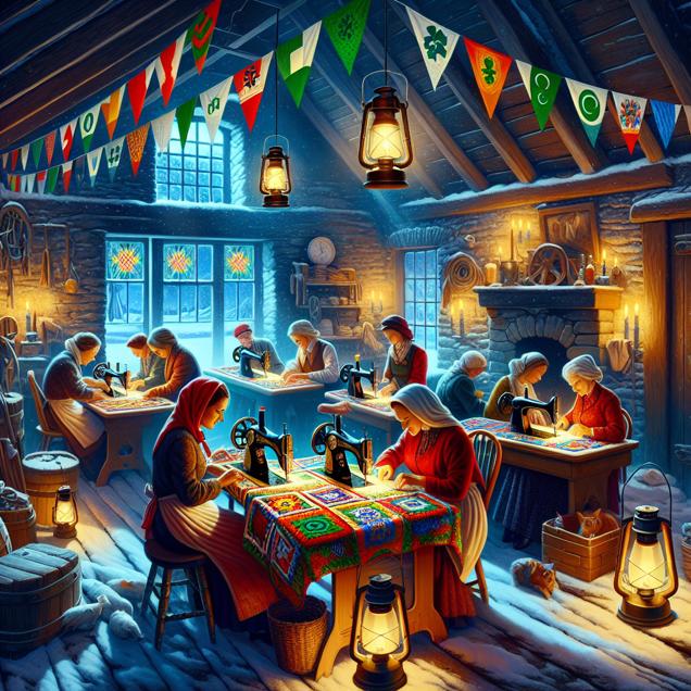 ChatGPT: In a cozy Irish cottage, a group of sewing machine operators from North Dakota are skillfully stitching together beautiful quilts by the warm glow of kerosene lanterns on a snowy evening.