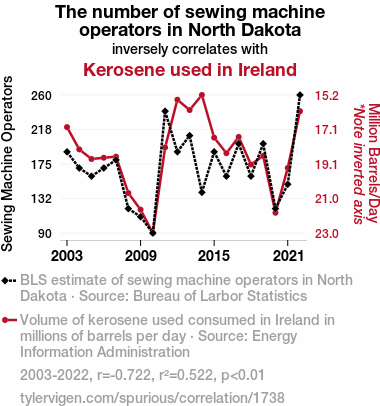 User prompt: Please provide potential search keywords for a paper titled Stitching Together the Thread of Correlation: The Curious Case of Sewing Machine Operators in North Dakota and Kerosene Consumption in Ireland with an abstract of The tantalizing enigma of the relationship between the number of sewing machine operators in North Dakota and kerosene consumption in Ireland has confounded scholars and enthusiasts alike. In this study, we endeavored to unravel this peculiar correlation using data from the Bureau of Labor Statistics and the Energy Information Administration. Our analysis unearthed a striking correlation coefficient of -0.7222491 and a p-value of less than 0.01 spanning the years 2003 to 2022. Hence, our findings suggest a statistically significant albeit befuddling relationship between these disparate variables. While our research may not quite sew up all the loose ends, it certainly adds a colorful thread to the fabric of knowledge.