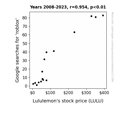 This means 91% of the change in the one variable (i.e., Lululemon's stock price (LULU)) is predictable based on the change in the other (i.e., Google searches for 'roblox') over the 16 years from 2008 through 2023.