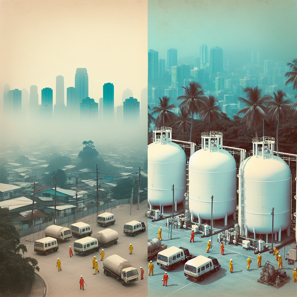 ChatGPT: Create an image resembling a retro Polaroid photo, showing a contrast between two scenes. On one side, capture the hazy skyline of Gadsden, Alabama, depicting thick smog and unhealthy air quality. On the other side, showcase a neat row of Liquefied Petroleum Gas (LPG) tanks in the Netherlands Antilles, with workers inspecting and maintaining them. Enhance the vintage appearance of the photo to contrast the environmental conditions in the two locations.