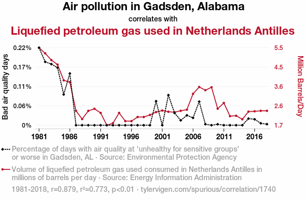 This means 77.3% of the change in the one variable (i.e., Liquefied petroleum gas used in Netherlands Antilles) is predictable based on the change in the other (i.e., Air pollution in Gadsden, Alabama) over the 38 years from 1981 through 2018.
