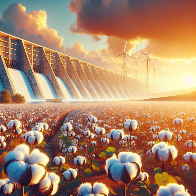 Prompt: Create an image of a futuristic scene in which a vibrant cotton field in Texas stretches into the distance, bathed in the warm golden light of the setting sun. The cotton plants sway gently in the wind, giving an impression of movement and life within this serene landscape. Adjacent to the cotton field, a towering hydroelectric dam is depicted with powerful water turbines churning with energy. The scene should exude a sense of harmony between nature and technology, with an overall aesthetic that feels both modern and tranquil. The depiction should include only scenes, people, and objects, it should not include text or speech bubbles.