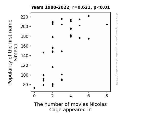 This means 38.6% of the change in the one variable (i.e., The number of movies Nicolas Cage appeared in) is predictable based on the change in the other (i.e., Popularity of the first name Simeon) over the 43 years from 1980 through 2022.