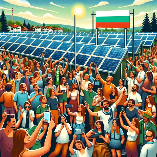 Prompt: Generate an image where a vibrant crowd gathers in Bulgaria around a solar panel installation. The people are taking selfies and chatting animatedly as they celebrate the clean energy being generated. A large, bold banner with the name "Silas" hangs prominently overhead, symbolizing the name's recent surge in popularity in the country. The scene exudes an atmosphere of excitement and positivity, capturing the growing reliance on solar power in Bulgaria. The image should embody a scalar art style, utilizing simple yet impactful visual elements to convey the energetic and celebratory atmosphere. The depiction should include only scenes, people, and objects, it should not include text or speech bubbles.