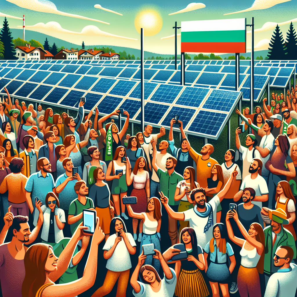 ChatGPT: Generate an image where a vibrant crowd gathers in Bulgaria around a solar panel installation. The people are taking selfies and chatting animatedly as they celebrate the clean energy being generated. A large, bold banner with the name "Silas" hangs prominently overhead, symbolizing the name's recent surge in popularity in the country. The scene exudes an atmosphere of excitement and positivity, capturing the growing reliance on solar power in Bulgaria. The image should embody a scalar art style, utilizing simple yet impactful visual elements to convey the energetic and celebratory atmosphere.