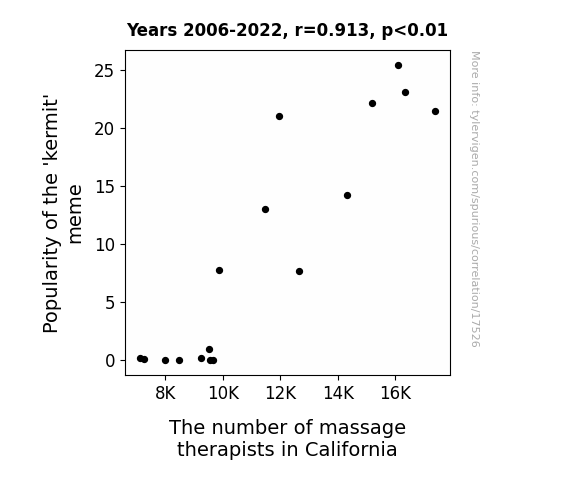 This means 83.4% of the change in the one variable (i.e., The number of massage therapists in California) is predictable based on the change in the other (i.e., Popularity of the 'kermit' meme) over the 17 years from 2006 through 2022.