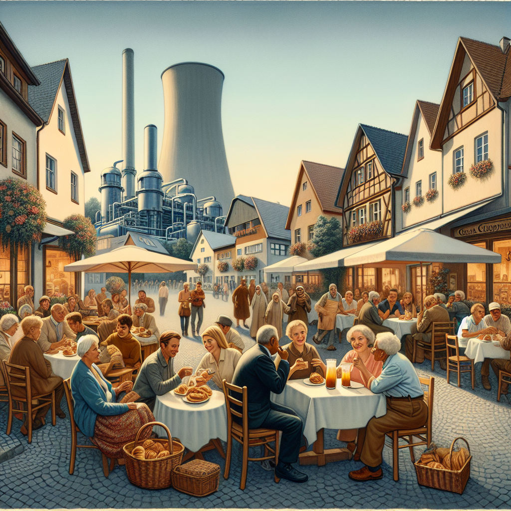 Prompt: Generate an image of a quaint German town scene where a cozy café is surrounded by people enjoying buttery pastries. In the background, a modern geothermal power plant quietly hums, providing sustainable energy to the community. The style should be reminiscent of a painting, using delicate brushstrokes and soft colors to capture the charm of the town juxtaposed with the modern sustainability of the power plant. The depiction should include only scenes, people, and objects, it should not include text or speech bubbles.