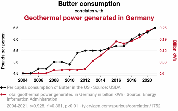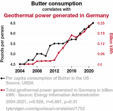butter consumption, geothermal power generation, Germany, USDA data, Energy Information Administration, correlation coefficient, p-value, renewable energy sources, dairy products