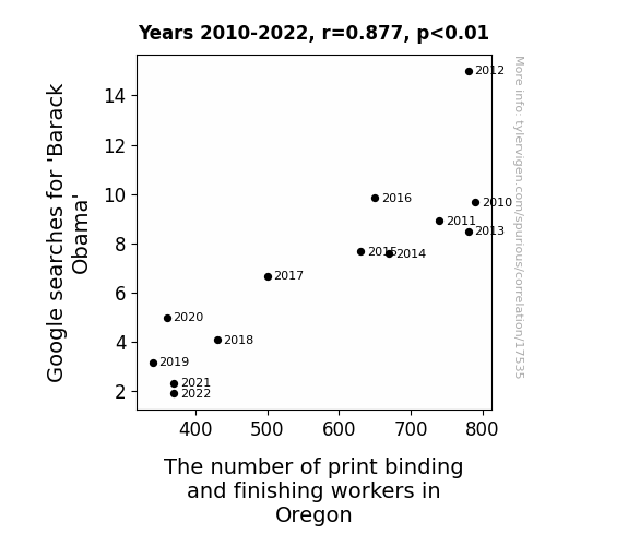 This means 76.9% of the change in the one variable (i.e., The number of print binding and finishing workers in Oregon) is predictable based on the change in the other (i.e., Google searches for 'Barack Obama') over the 13 years from 2010 through 2022.