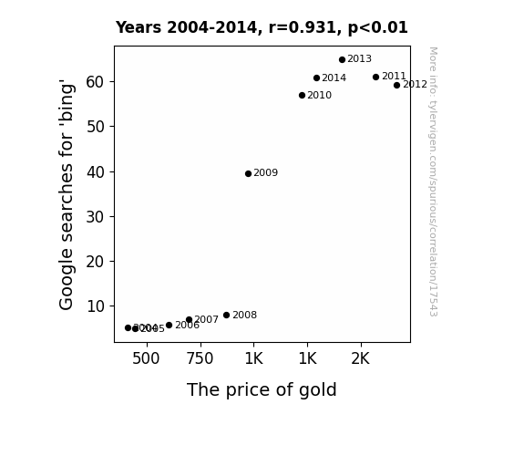 This means 86.6% of the change in the one variable (i.e., The price of gold) is predictable based on the change in the other (i.e., Google searches for 'bing') over the 11 years from 2004 through 2014.