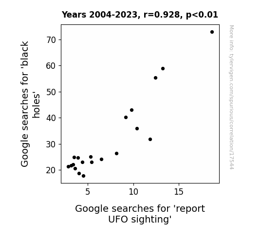 This means 86.1% of the change in the one variable (i.e., Google searches for 'report UFO sighting') is predictable based on the change in the other (i.e., Google searches for 'black holes') over the 20 years from 2004 through 2023.
