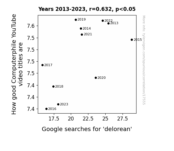 This means 40% of the change in the one variable (i.e., Google searches for 'delorean') is predictable based on the change in the other (i.e., How good Computerphile YouTube video titles are) over the 11 years from 2013 through 2023.