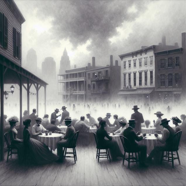 ChatGPT: Generate an image that captures the solemn atmosphere of a North Carolina city. The scene should show outdoor cafes shrouded in a thick haze, with couples seated at tables, their strained conversations barely audible. The smog-filled sky should cast a somber tone over the city, reflecting the heavy hearts of many couples navigating the complexities of divorce in Winston, North Carolina. The image should depict the struggles and emotional weight of these individuals amidst the urban backdrop, allowing the viewer to feel the weight of the atmosphere and emotions within the city.