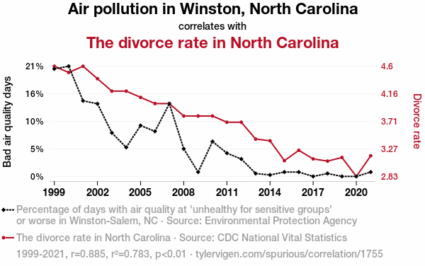 - The spurious research paper: Air Pollution or Marital Dissolution? An Examination of the Relationship Between Air Quality in Winston, North Carolina and the Divorce Rate in North Carolina