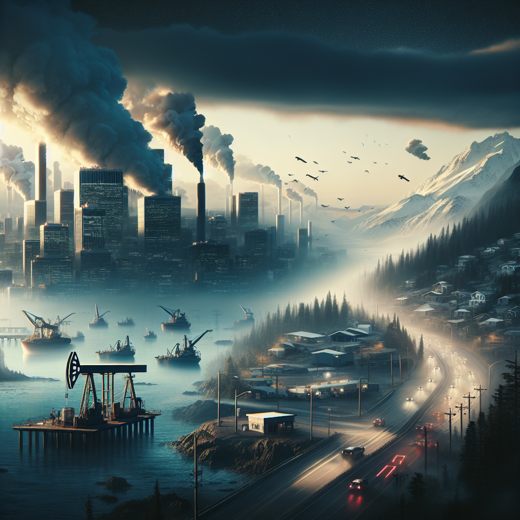 User prompt: Please respond with an image generation prompt that would be likely to create an interesting visual using DALLE-3, using the following style: [ Concept art ] and depicting this scene: In Juneau, Alaska, smog hangs over the city as cars and trucks line up at a petrol station in Eritrea. The haze from petroleum consumption in Eritrea drifts across the oceans and merges with the less than ideal air quality in Juneau, Alaska. Keep the visual depiction simple. Do not include any words or speech bubbles.