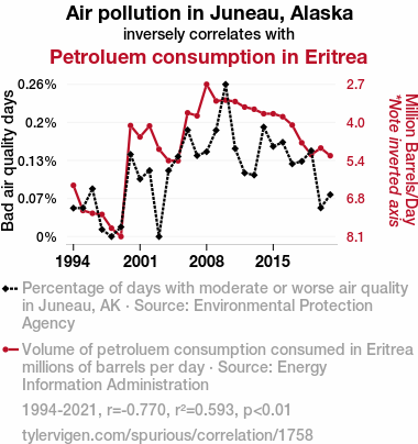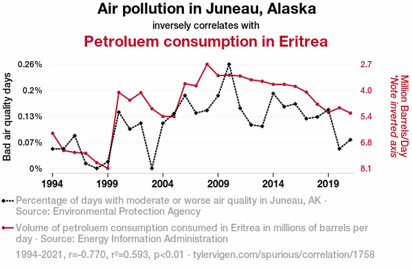 - The spurious research paper: Air We Paying Attention? Exploring the Relationship Between Air Pollution in Juneau, Alaska and Petroleum Consumption in Eritrea
