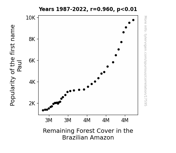 This means 92.2% of the change in the one variable (i.e., Remaining Forest Cover in the Brazilian Amazon) is predictable based on the change in the other (i.e., Popularity of the first name Paul) over the 36 years from 1987 through 2022.