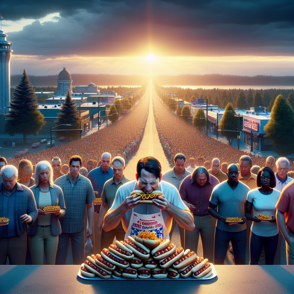 Prompt: Generate an image of a hazy sky casting a warm glow over the city of Kennewick, Washington. In the foreground, show a diverse crowd of people lining up along a street, eagerly watching as the reigning Nathan's Hot Dog Eating Competition Champion consumes a towering mountain of hotdogs. The scorching sun beats down as the champion's impressive feat unfolds, creating a palpable atmosphere of anticipation and excitement in the air. The depiction should include only scenes, people, and objects, it should not include text or speech bubbles.