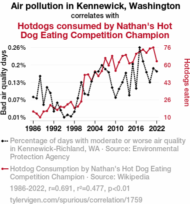 air pollution Kennewick, Washington, Nathan's Hot Dog Eating Champion, hotdog consumption, correlation between air pollution and eating competition, environmental factors, competitive eating, EPA data, Wikipedia, correlation coefficient, p-value, Kennewick air pollution effects, Nathan's Hot Dog Eating Competition Champion