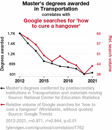 - The spurious research paper: Miles to Mojitos: Analyzing the Correlation Between Master's Degrees in Transportation and 'How to Cure a Hangover' Google Searches