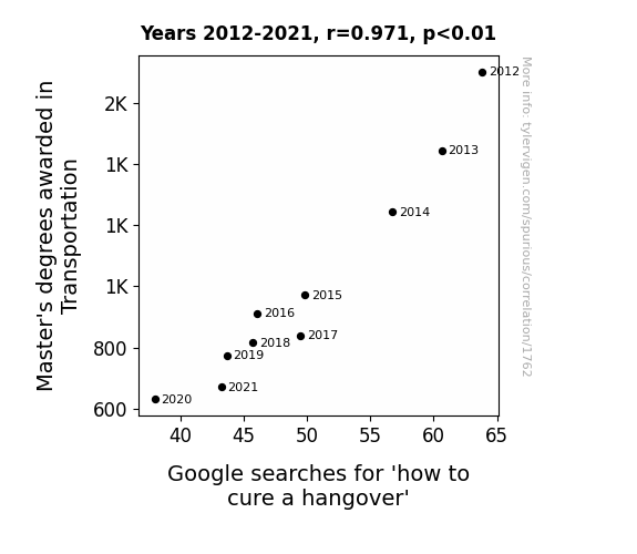 Master's degrees in transportation, Google searches, hangover cure, correlation, National Center for Education Statistics, statistical analysis, transportation education, academic research